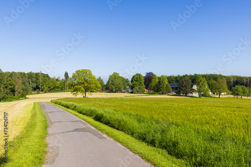 Idyllischer Weg zwischen grünen Feldern im Sommer