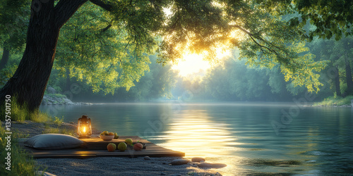 Idyllisches Picknick am ruhigen See im Morgenlicht
