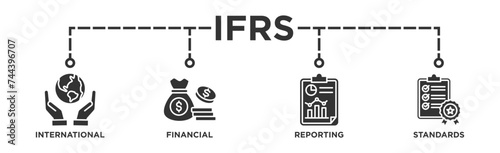 IFRS banner web icon illustration concept for international financial reporting standards with icon of global, network, money, documents, books, and writing