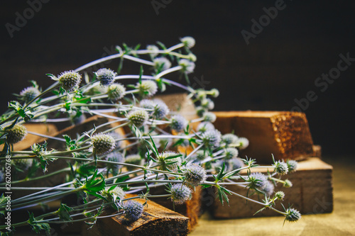 Ikebana. Bouquet of prickly dried flowers in a pile of wooden bars. still life of flowers and wood. blue thorn close up