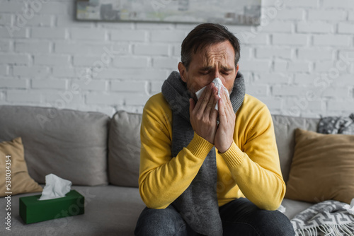 ill man in warm scarf sneezing in paper napkin with closed eyes while sitting on couch.