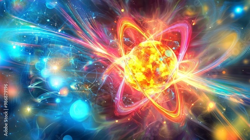 Illuminated Atom: Abstract Nuclear Fission Art with Colorful Energy Swirls