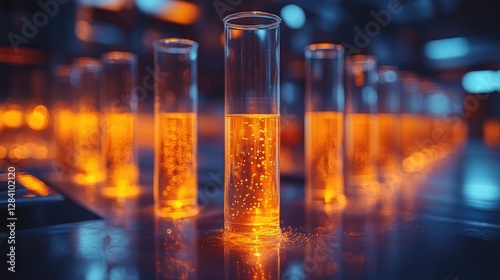 Illuminated Beakers and Test Tubes in a High-Tech Science Lab