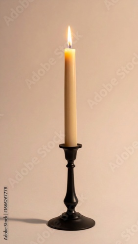 Illuminated Beige Candle with Black Candleholder in Beige Background Close Up