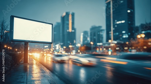 Illuminated Billboard on City Street at Night, Blank White Mockup for Advertising Displays and Urban Commercial Messages