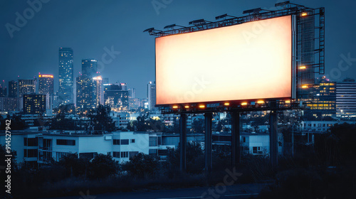 Illuminated Blank Billboard Overlooking Modern City Skyline at Night with Skyscrapers Background, Urban Advertising Space, Evening Architecture