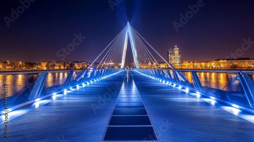 Illuminated Bridge at Night Showcasing Modern Architecture and Vibrant Reflections on Water with a Cityscape in the Background