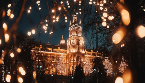 Illuminated building at night, framed by glowing lights. Festive ambiance