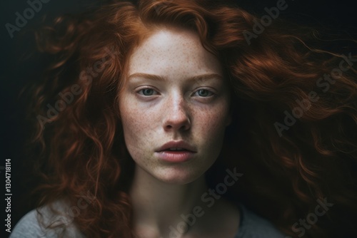 Illuminated by a gentle light, a young woman with vibrant red curly hair gazes intensely. Her freckled skin highlights a mixture of emotions, embodying both serenity and strength in her expression