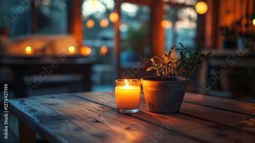 Illuminated Candle and Plant on Wooden Table