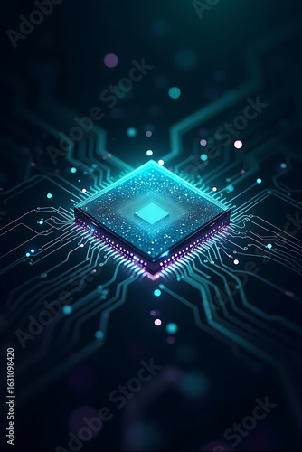 Illuminated central processing unit (CPU) on a circuit board, glowing brightly.