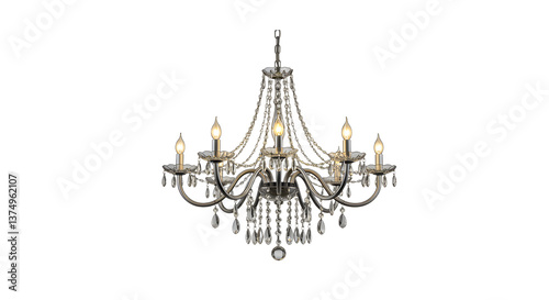 Illuminated Chandelier with Crystals Suspended on White Background