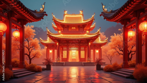 Illuminated Chinese Temple, Lantern Festival - Asian-inspired design