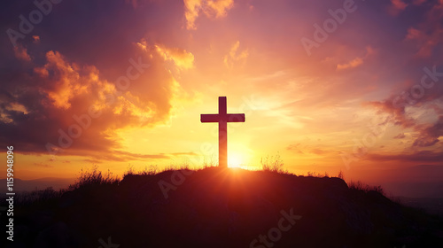 Illuminated Christian Cross Silhouette at Majestic Sunset Horizon : Generative AI