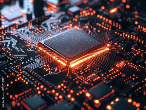 Illuminated circuit board with microchip, showcasing technology, engineering, and intricate design, highlighting the interconnectedness of systems.