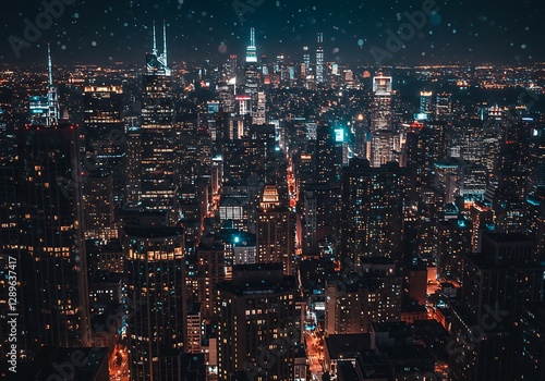 Illuminated Cityscape View at Night with Many High Rise Buildings