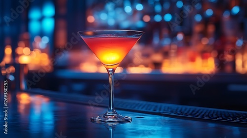 Illuminated cocktail glass with bright neon reflections in a stylish lounge