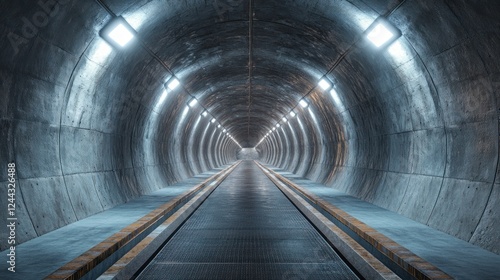 Illuminated Concrete Tunnel Pathway, Underground Infrastructure, Cityscape Background