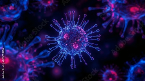 Illuminated coronavirus cells glow with vibrant blue and pink hues, ready to infect