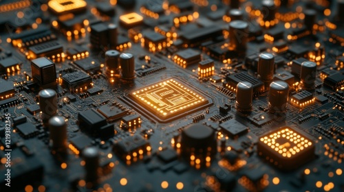 Illuminated CPU on circuit board, glowing components, tech background, digital design
