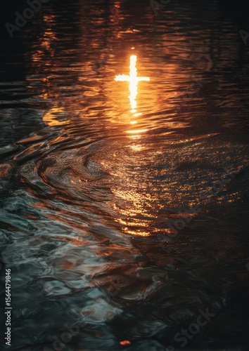 Illuminated cross reflection floating in aquatic ripples evoking spiritual solace and contemplation