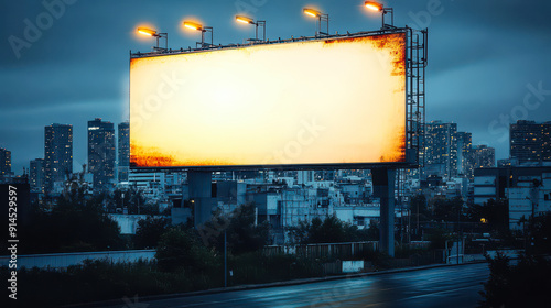 Illuminated Empty Billboard in Modern Cityscape at Night with Urban Background and Skyscrapers
