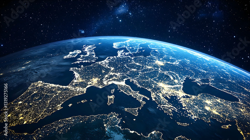 Illuminated Europe At Night From Space With Visible City Lights And Starry Background