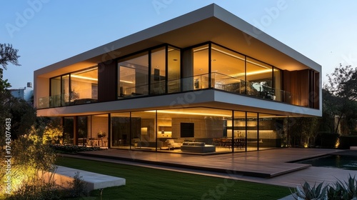 Illuminated evening reveal of a modern architectural sleek home design in an urban setting showcasing innovative living concepts from an elevated perspective