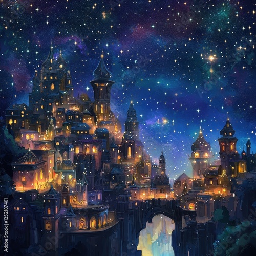 Illuminated fantasy city sits beneath a mesmerizing starlit night sky