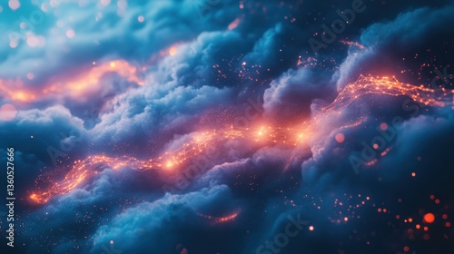 Illuminated floating village bridges in a dreamlike landscape with ethereal clouds and celestial bodies