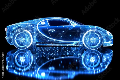 Illuminated futuristic car design featuring glowing blue lights against a black background
