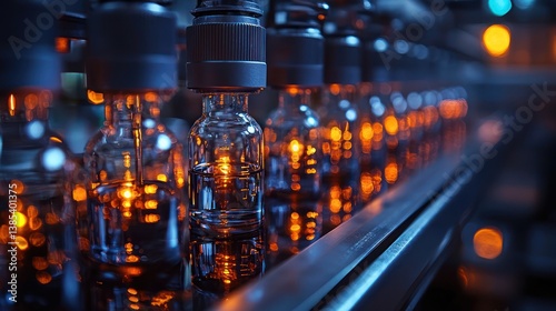 Illuminated glass tubes on production line; factory background; industrial manufacturing process; stock photo