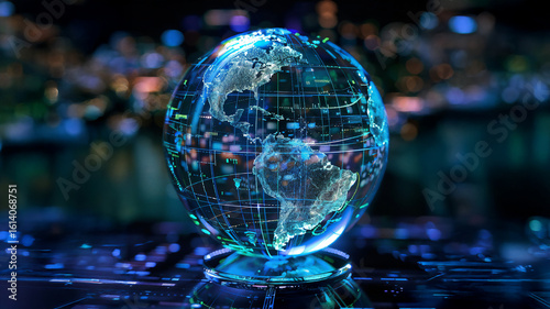Illuminated globe sphere with continents visible reflects colorful bokeh lights creating magical earth visualization on dark surface with atmospheric glow