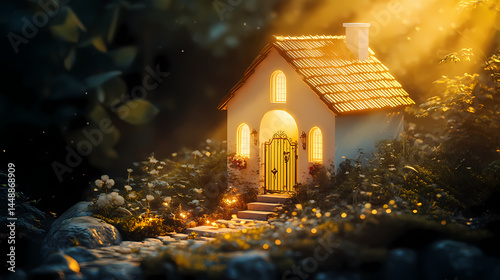 Illuminated home model with keys: a symbol of new beginnings and real estate. [Dream Architectures] | Gravity Arches | floating gates. Illustration