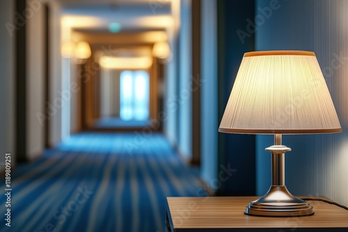 Illuminated Hotel Corridor: A Warm Table Lamp Glows Softly in a Modern Interior, Casting a Gentle Light Down a Long Hallway.