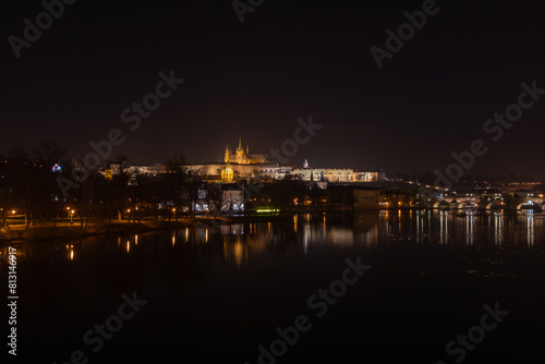 Illuminated Hradcany (Prague Castle) and Charles Bridge, St. Vitus Cathedral and St. George church, medieval architecture, Vltava river at night, Bohemia, Czech Republic.