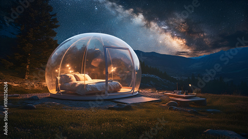 Illuminated igloo at night in winter forest, 3D rendering, Glamping house surrounded by nature, glamping in the beautiful countryside, luxury glamping, glamorous camping