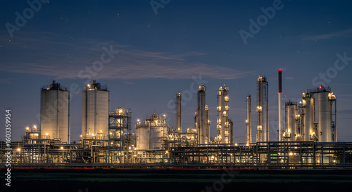 Illuminated Industrial Landscape at Night Under Starry Skies, Factory Power and Light Shines Bright on a Dark Night