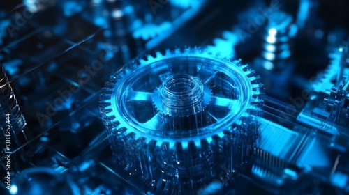 Illuminated intricacies: a luminous rendering of interlocking mechanical gears and precision components in electric blue.
