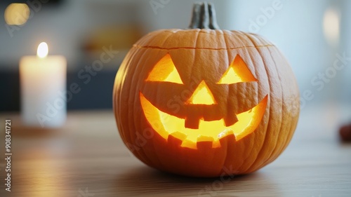 Illuminated jack-o'-lantern on wooden table, candle in background