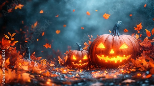Illuminated Jack-o'-Lanterns in a Misty Forest Setting with Falling Autumn Leaves