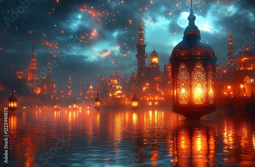 Illuminated Lanterns Floating on Water with a Mystical Cityscape and Starry Sky