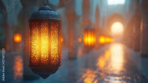 Illuminated lanterns in a Moroccan courtyard at sunset