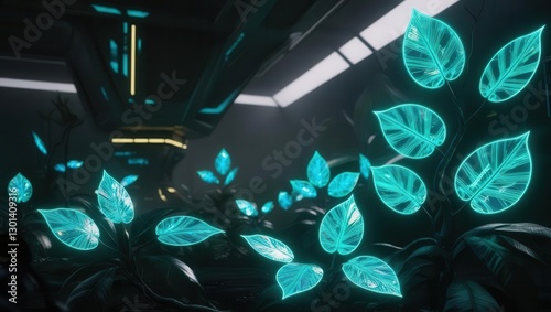Illuminated leaf growth in futuristic greenhouse digital art sci-fi environment low angle