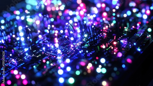 Illuminated LED Circuit Board Displaying Vivid Colors in a Dimly Lit Environment.