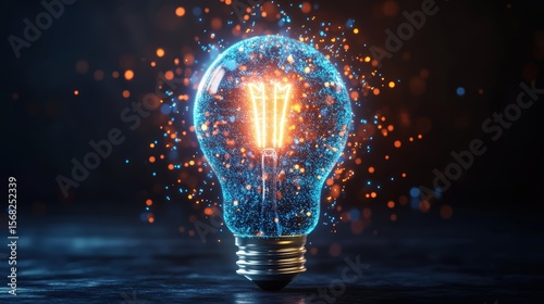 Illuminated light bulb with glowing filament and sparkling particles creating a luminous energy effect