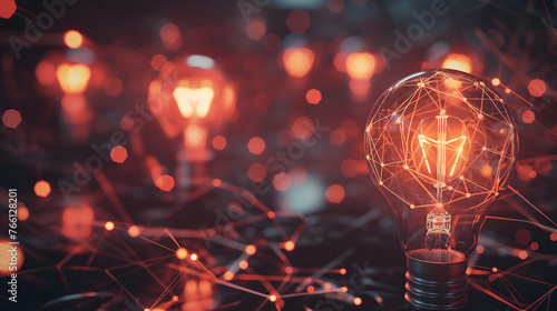 Illuminated Light Bulbs on a Dark Background with Network Connections