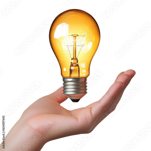 Illuminated lightbulb held gently in a human hand against a transparent background concept of innovation
