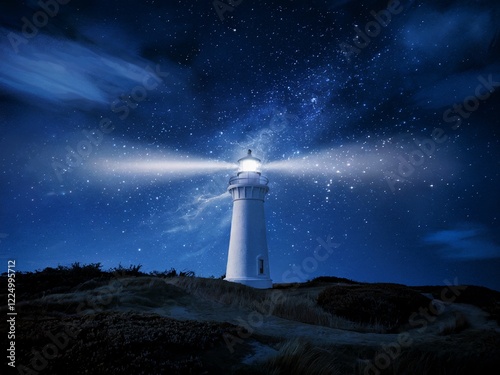 Illuminated Lighthouse Guiding Under a Starlit Sky During Nighttime