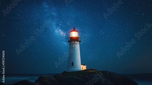 Illuminated lighthouse on rocky coast under a starry night sky.